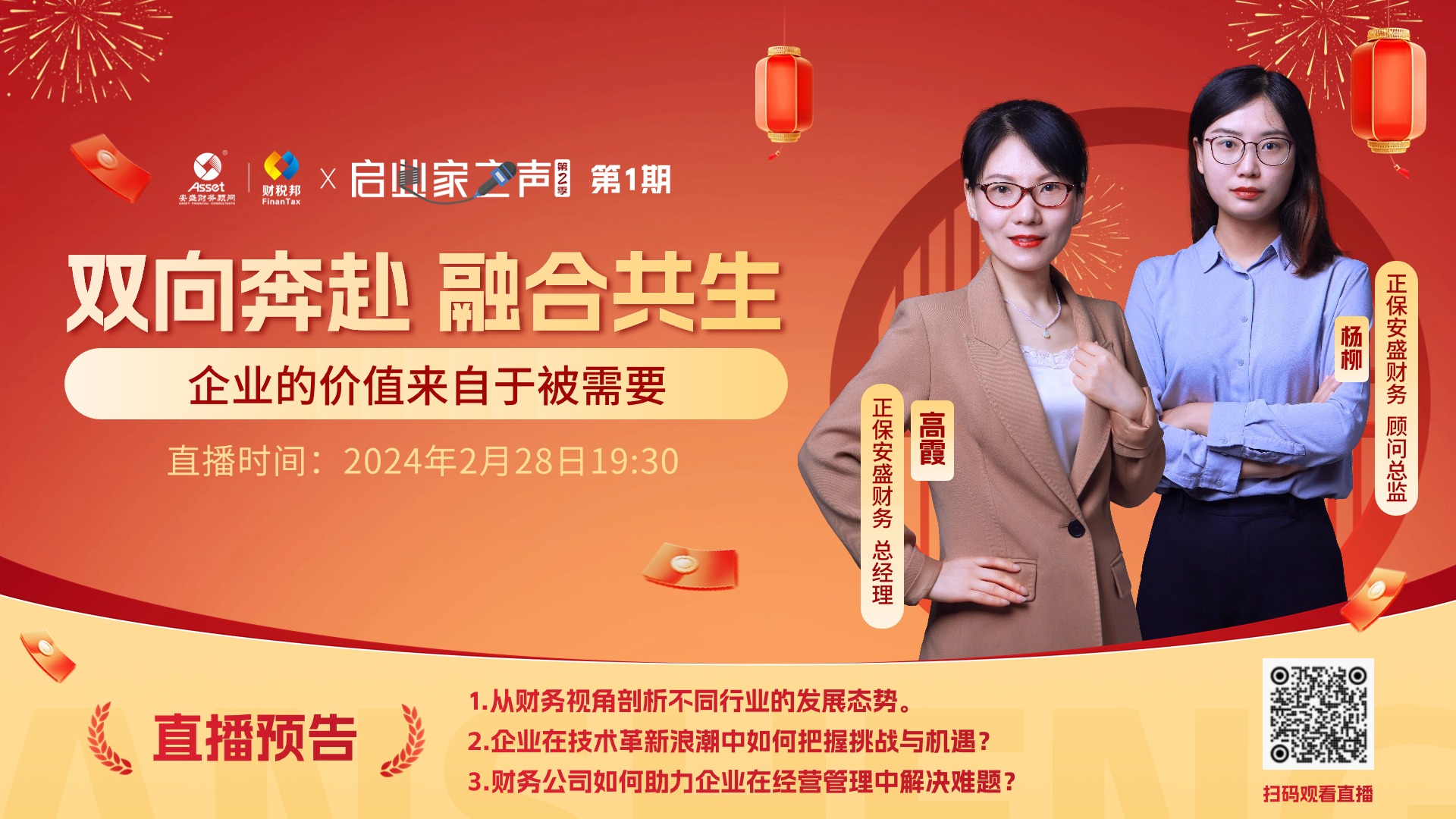 2024年2月28日19:30,正保安盛財務(wù)視頻號推出《啟業(yè)家之聲》第二季第1期《【雙向奔赴 融合共生】企業(yè)的價(jià)值來(lái)自于被需要》龍年首場(chǎng)主題直播,邀請正保安盛財務(wù)總經(jīng)理高霞和咨詢(xún)顧問(wèn)中心總監楊柳與大家線(xiàn)上交流互動(dòng)。