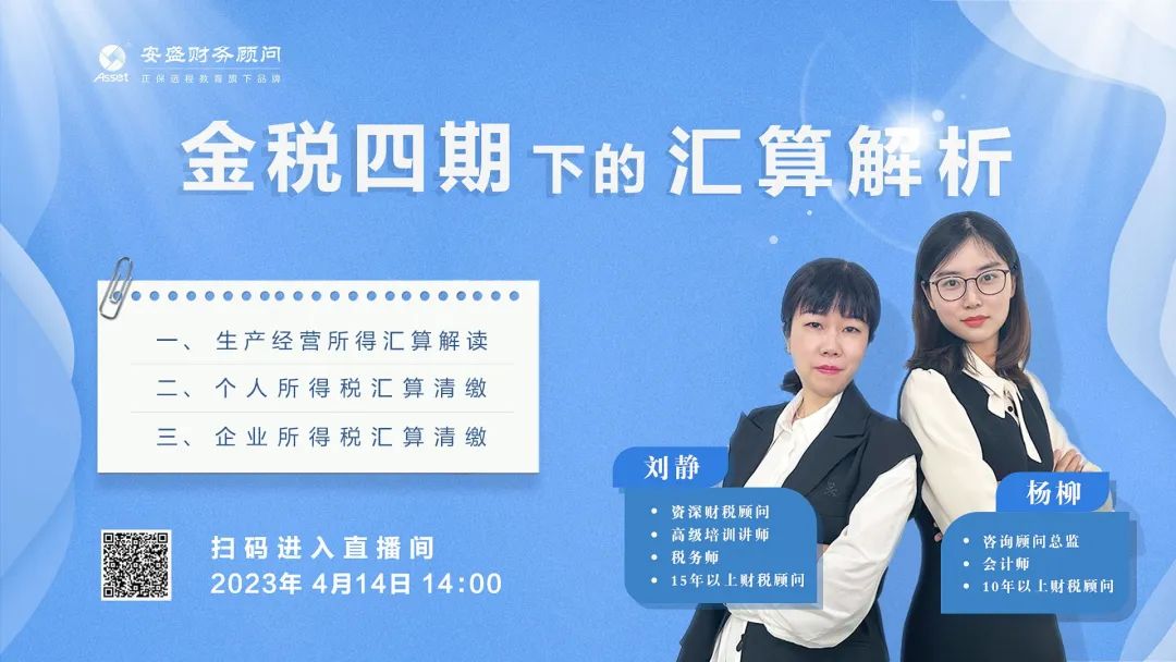 4月14日14時(shí),安盛財務(wù)組織開(kāi)展“安盛財稅云課堂”第七期——線(xiàn)上直播培訓課《金稅四期下的匯算解析》,本次直播培訓課邀請咨詢(xún)顧問(wèn)中心劉靜老師和楊柳老師給大家進(jìn)行精彩的講解。